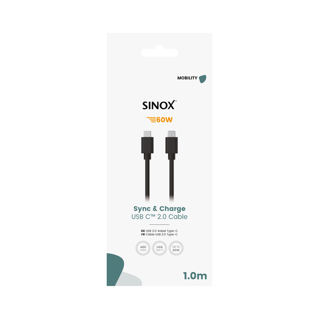 Sinox USB C kabel. 1m. Sort