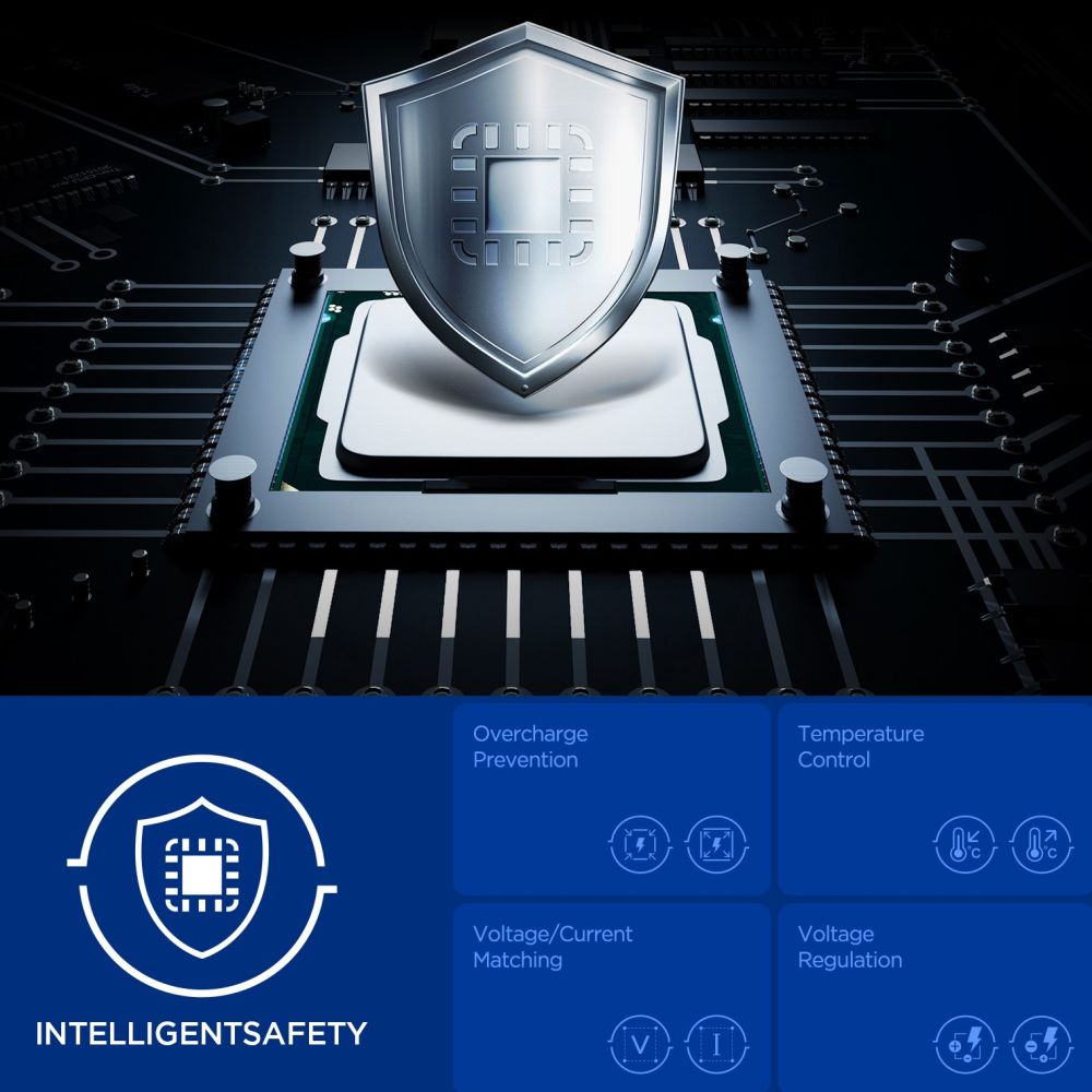 Thanks to Quantum Boost technology, the charger automatically adjusts power to the connected device, maximizing efficiency and reducing charging time. Built-in Overcharge Prevention, Voltage Matching, and Voltage Regulation features protect devices against overcharging, voltage fluctuations, and excessive current, ensuring safe and stable charging in all conditions.