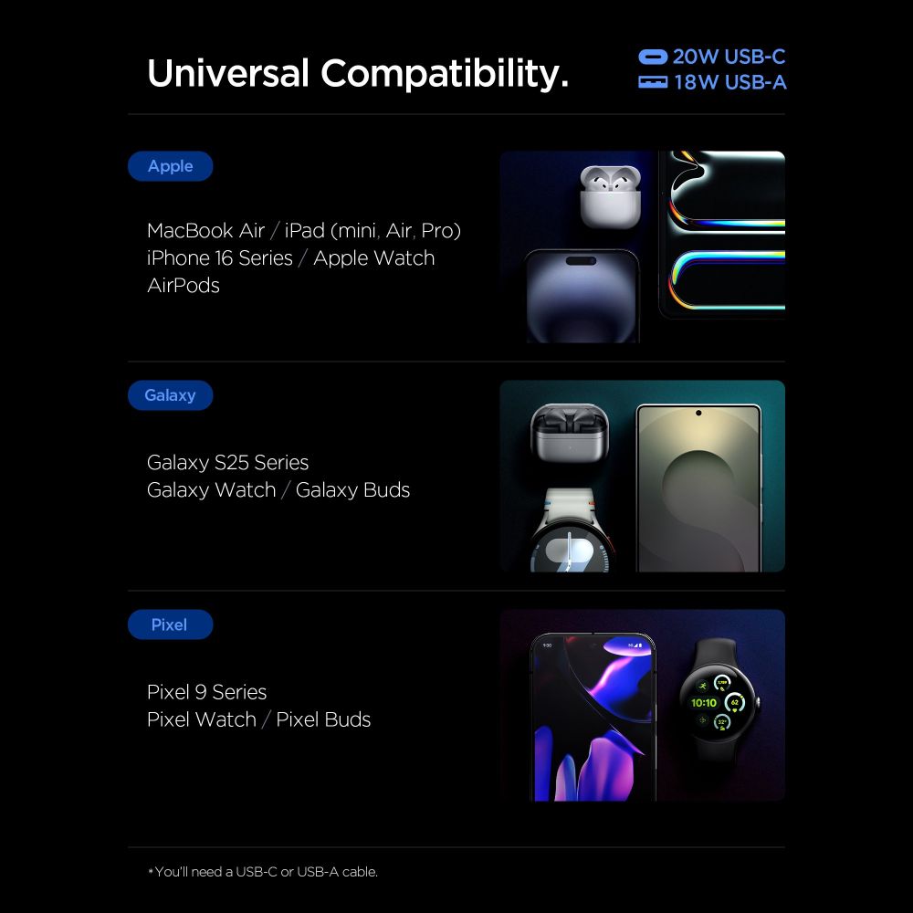 The Spigen Essential EE202EU is a compact, efficient GaN Pro wall charger designed to quickly and safely charge two devices simultaneously. Equipped with a 20W USB-C and 18W USB-A ports, it allows you to simultaneously charge smartphones, tablets, headphones, and other accessories, ensuring optimal power for each connected device.