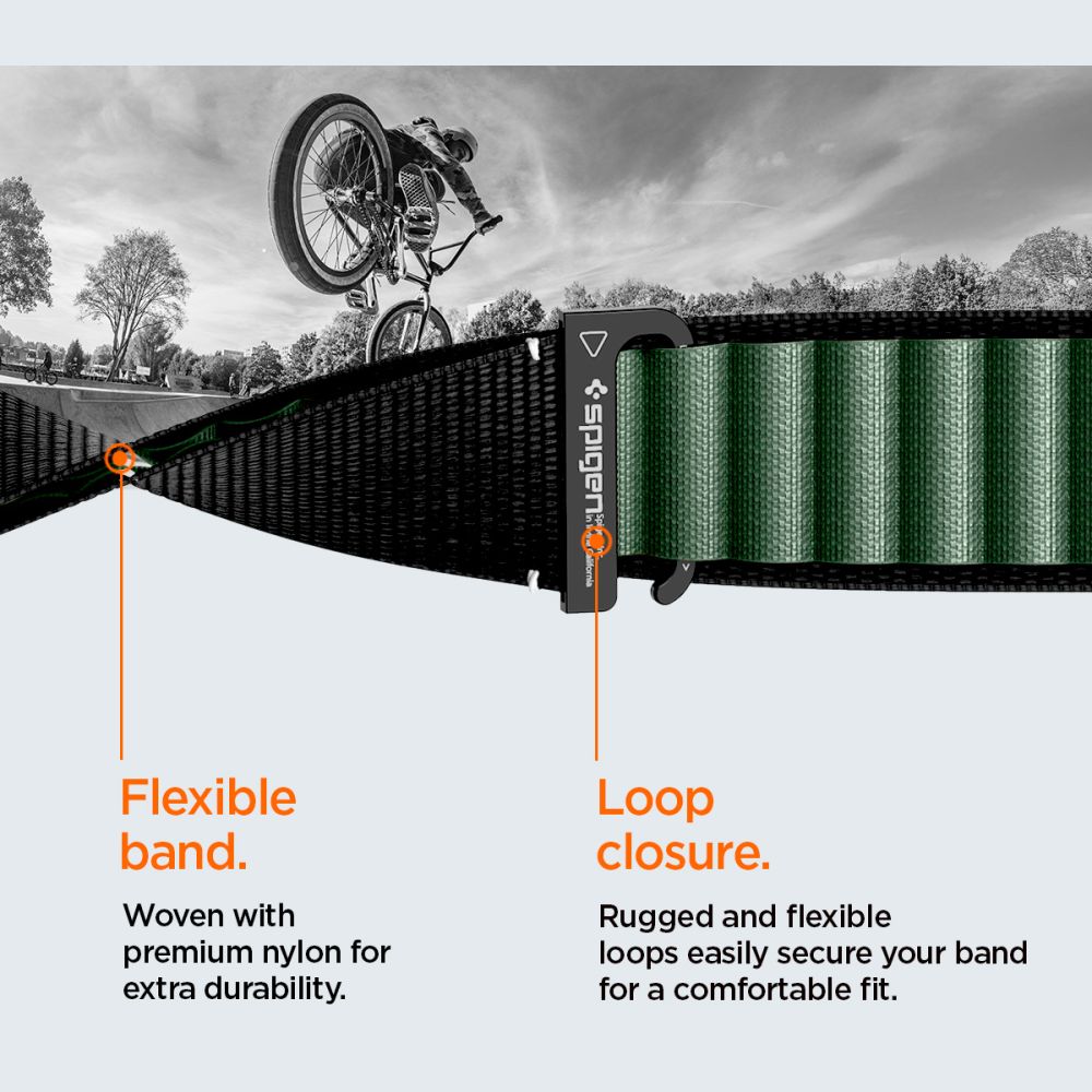 The Spigen WBF1 strap is an elegant and modern accessory made of durable nylon that combines a sporty character with minimalist style. Equipped with a sturdy hook-and-loop buckle and a loop closure, it ensures a secure and stable fit during everyday use and intense activities.