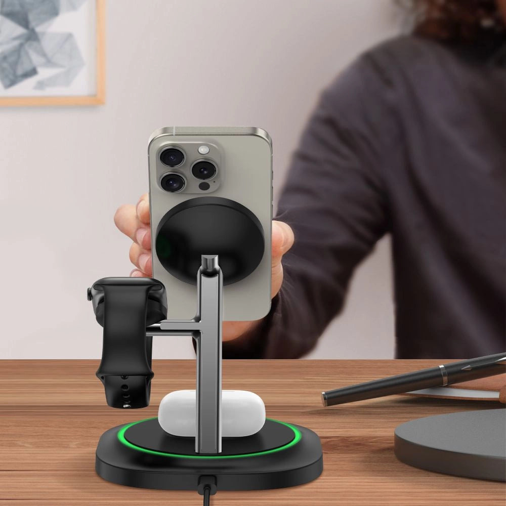 Tech-Protect QI15W-A46 – a modern, magnetic 3-in-1 wireless charger, created for users who value comfort and aesthetics. Thanks to support for MagSafe technology and the ability to charge three devices simultaneously, it is an ideal solution for the office, bedroom or living room. The charger supports fast charging with a power of up to 15W for smartphones, 2.5W for smartwatches and 3W for headphones, and compliance with PD and QC3.0 protocols ensures stable and efficient power supply for devices.