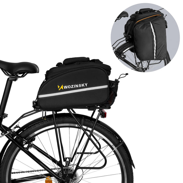 The Wozinsky WBB19BK bicycle carrier bag is one of the most functional bags in our offer . It has many practical solutions: folding, large bicycle panniers, rain cover, comfortable internal compartments, shoulder strap . Depending on your needs, you can quickly and conveniently increase its usable area. It is a great accessory for closer and further escapades . The bike rack bag is also easy to assemble and disassemble for quick taking with you.