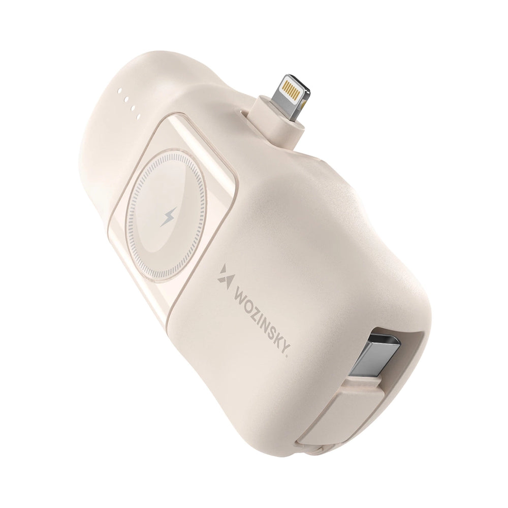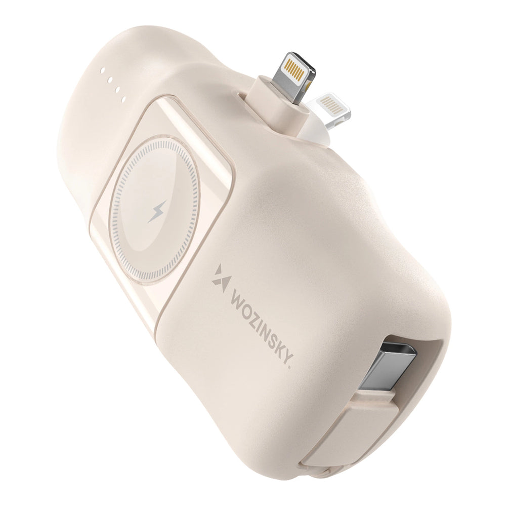Wozinsky WF16-YLS 5000mAh 15W Lightning Mini Power Bank med indbygget USB-C-kabel og Apple Watch-oplader - Beige .