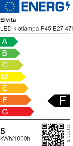 Elvita P45 LED-lyskilde med en E27 fatning. Den har en levetid på 15 000 timer.Effekten er 5,5 W, lysstrømmen er 470 lm og lyset er varmt hvidt med 2800 K.