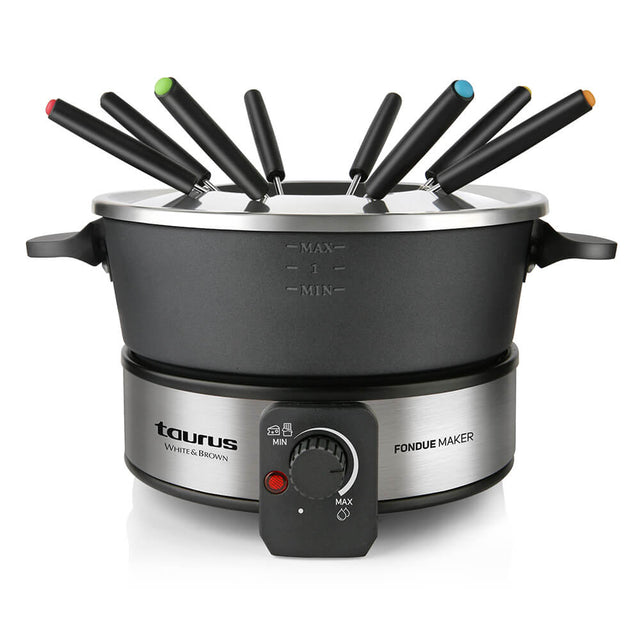 1000W Taurus Fondue opvarmes hurtigt til lækre måltider med familie & venner - leveres med 8 opvaskemaskinesikre gafler & 2L non-stick PFOA-fri gryde