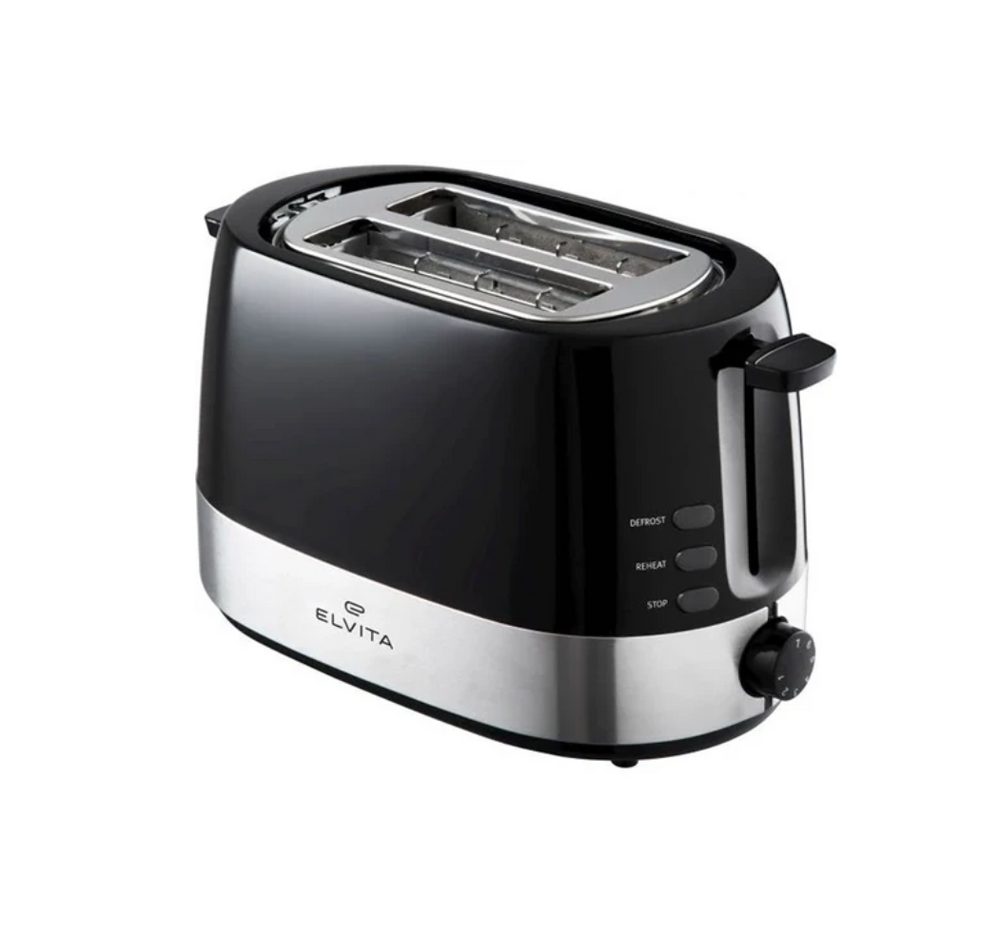 Stilfuld brødrister til to skiver brødForædl din morgenmad med en lille og praktisk brødrister fra Elvita i et sort/rustfrit design. Brødristeren har en effekt på 850 W og kan riste to skiver brød på samme tid.