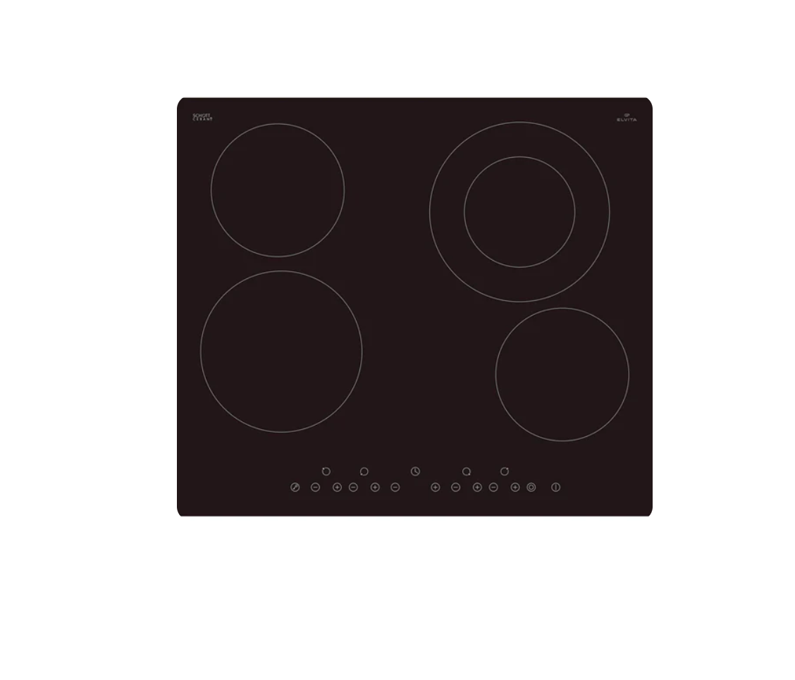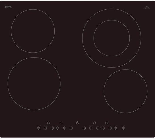 Den keramiske kogeplade CKH2262S er en indbygningskogeplade fra Elvita med stor ydeevne og brugervenlighed. En af de fire kogezoner er fleksibel, så den kan tilpasses til forskellige gryder.