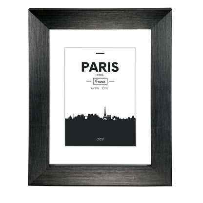 Plastramme med børstet aluminiums look. Du kan lade rammen stå op eller hænge den på væggen