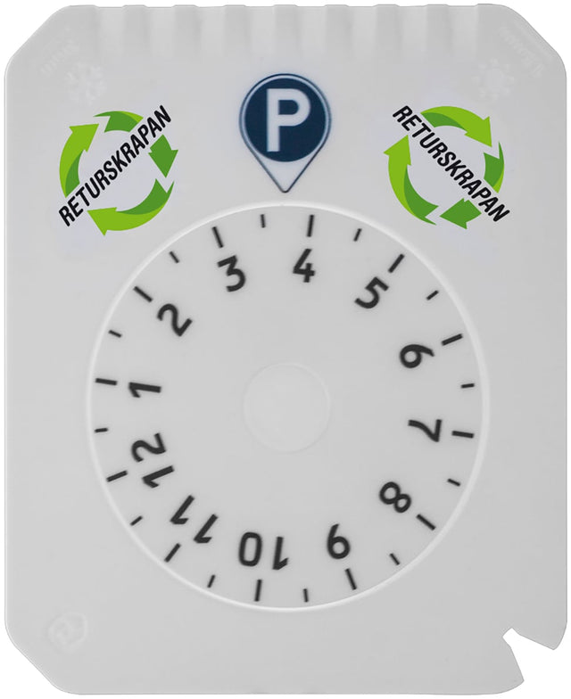 En smart isskraber med indbygget parkeringsur. Isskraberen, der er produceret i Sverige, består af mindst 50 % genbrugsmateriale.